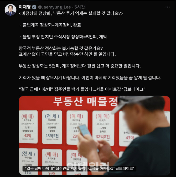 조용술 대변인도 논평을 내고 “이재명 대통령이 SNS를 통해 ‘기회가 있을 때 잡아라. 이번이 마지막 기회다’라고 말하며 매물을 내놓지 않는 주택 소유자를 사실상 협박했다”고 꼬집었다.