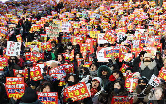 국민의힘에서 제명된 한동훈 전 대표 지지자들이 31일 오후 서울 여의도공원 앞에서 열린 당 지도부 규탄 집회에서 '부당징계 규탄' 구호를 외치고 있다. 2026.1.31/뉴스1 © News1 오대일 기자