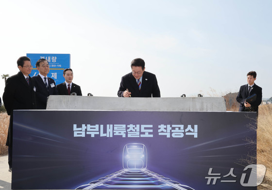이재명 대통령이 6일 경남 거제시 견내량 인근에서 열린 남부내륙철도 착공식에서 착공기념 세레머니를 하고 있다. 왼쪽부터 박완수 경남도지사, 김윤덕 국토교통부 장관, 이재명 대통령, 김경수 지방시대위원장 2026.2.6 / © 뉴스1 이재명 기자