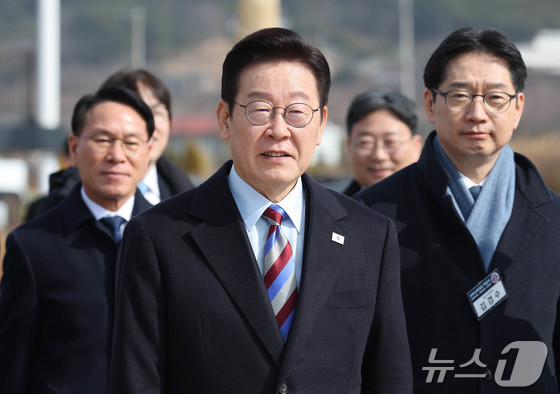 이재명 대통령이 6일 경남 거제시 견내량 인근에서 열린 남부내륙철도 착공식에 입장하고 있다. 2026.2.6 / © 뉴스1 이재명 기자