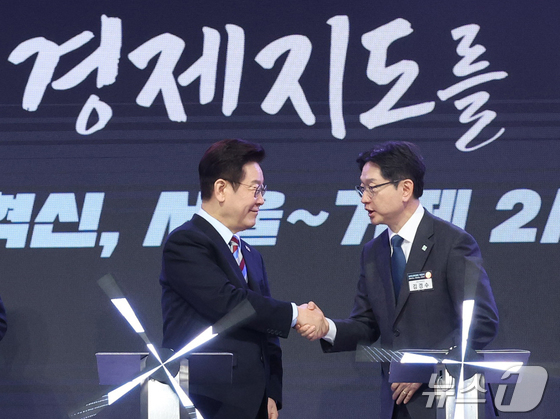 이재명 대통령이 6일 경남 거제시 견내량 인근에서 열린 남부내륙철도 착공식에서 김경수 지방시대위원장과 악수를 하고 있다. (청와대통신사진기자단) 2026.2.6 / © 뉴스1 이재명 기자
