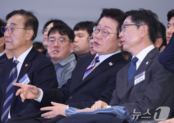이재명 대통령이 6일 경남 거제시 견내량 인근에서 열린 남부내륙철도 착공식에서 김경수 지방시대위원장과 대화를 하고 있다. (청와대통신사진기자단) 2026.2.6 / © 뉴스1 이재명 기자