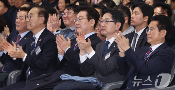 이재명 대통령이 6일 경남 거제시 견내량 인근에서 열린 남부내륙철도 착공식에서 박수를 치고 있다. (청와대통신사진기자단) 2026.2.6 / © 뉴스1 이재명 기자