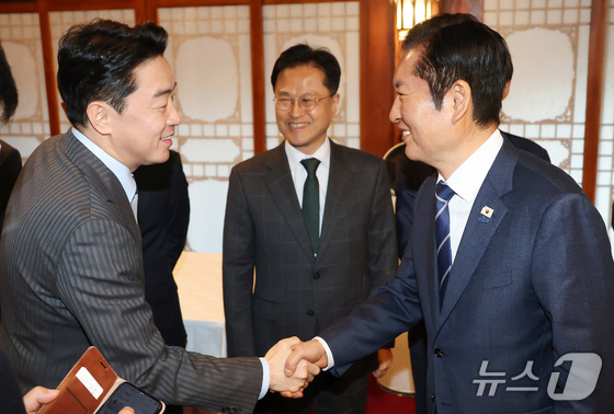 강훈식 대통령비서실장과 정청래 더불어민주당 대표가 8일 오후 서울 종로구 국무총리공관에서 열린 고위당정협의회에서 인사를 나누고 있다. (공동취재) 2026.2.8 © 뉴스1 최지환 기자