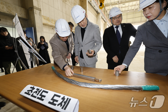 장동혁 국민의힘 대표가 11일 전남 나주 한국에너지공과대학교를 방문해 초전도 기술센터 건립현장을 찾아 브리핑을 듣고 있다. 2026.2.11 © 뉴스1 김태성 기자