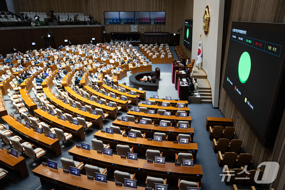 12일 서울 여의도 국회에서 열린 제432회 국회(임시회) 제7차 본회의에서 법원조직법 일부개정법률안(대안)이 재석 160인 중 찬성 160인으로 가결되고 있다. 2026.2.12 © 뉴스1 유승관 기자