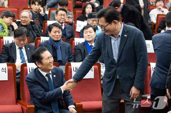 정청래 더불어민주당 대표와 송영길 소나무당 대표가 지난 10일 서울 여의도 국회도서관에서 열린 박찬대 출판기념회 '검은싸락눈' 에서 인사하고 있다. 2026.2.10 © 뉴스1 유승관 기자