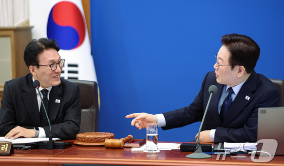 이재명 대통령과 김민석 국무총리가 지난 10일 청와대에서 열린 국무회의에서 대화를 하고 있다. 2026.2.10 © 뉴스1 허경 기자