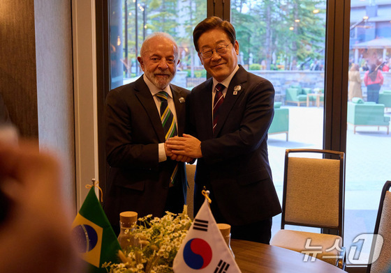 이재명 대통령이 이나시우 룰라 다 시우바 브라질 대통령과 17일(현지시간) 캐나다 앨버타주 캐내내스키스 주요 7개국(G7) 정상회의장에서 한·브라질 정상회담을 하고 있다. (대통령실 제공. 재판매 및 DB 금지) 2025.6.19 © 뉴스1 박지혜 기자