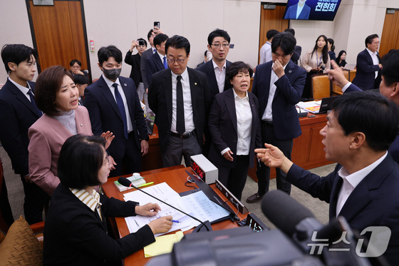 나경원 국민의힘 의원이 22일 서울 여의도 국회 법제사법위원회에서 열린 검찰개혁 입법청문회에서 퇴장 명령을 한 추미애 위원장에게 항의하고 있다. 2025.9.22 © 뉴스1 신웅수 기자