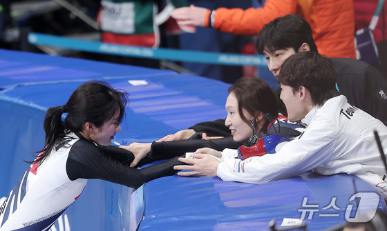 쇼트트랙 최민정, 황대헌, 임종언이 16일(현지시간) 이탈리아 밀라노 아이스스케이팅 아레나에서 열린 2026 밀라노·코르티나담페초 동계올림픽 쇼트트랙 여자 1000m 결승에서 동메달을 따낸 김길리를 축하하고 있다. 2026.2.16 © 뉴스1 김성진 기자