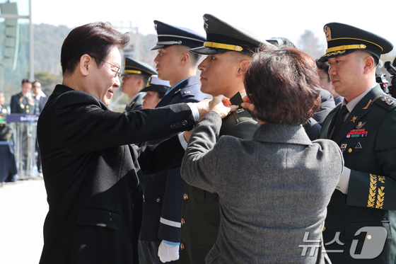 이재명 대통령이 20일 충남 계룡대 대연병장에서 열린 육·해·공군 사관학교 통합임관식에서 임관 장교에게 계급장을 달아주고 있다. 2026.2.20 © 뉴스1 이재명 기자