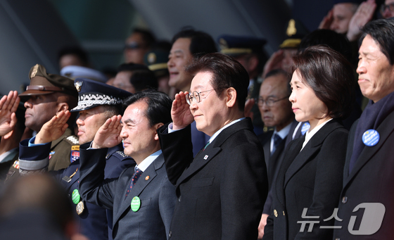 이재명 대통령이 20일 충남 계룡대 대연병장에서 열린 육·해·공군 사관학교 통합임관식에서 거수경례를 하고 있다. (청와대통신사진기자단) 2026.2.20 © 뉴스1 이재명 기자