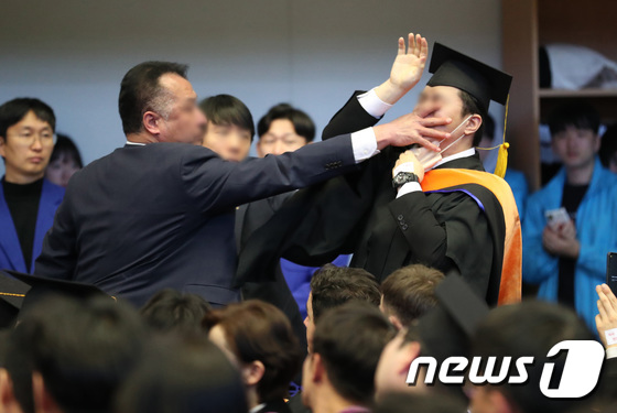 지난 2024년 2월 16일 오후 대전 유성구 한국과학기술원(KAIST)에서 열린 2024년 학위수여식에서 한 졸업생이 졸업식을 방문한 윤석열 대통령에게 항의하자 경호원들로부터 제지를 당하고 있다. (대전충남공동취재단) 2024.2.16 © 뉴스1 김기태 기자