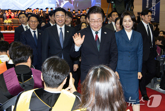 이날 이 대통령은 환한 미소로 행사장에 입장해 졸업생들과 손을 맞잡고 일부 학생들과 하이파이브를 나누며 인사를 했다.