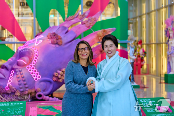 김혜경 여사와 루이스 이나시우 룰라 다시우바 브라질 대통령 부인 호잔젤라 다시우바 여사가 21일 경기 파주 국립민속박물관에서 기념촬영을 하고 있다. (청와대 제공. 재판매 및 DB 금지) 2026.2.21 © 뉴스1 이재명 기자