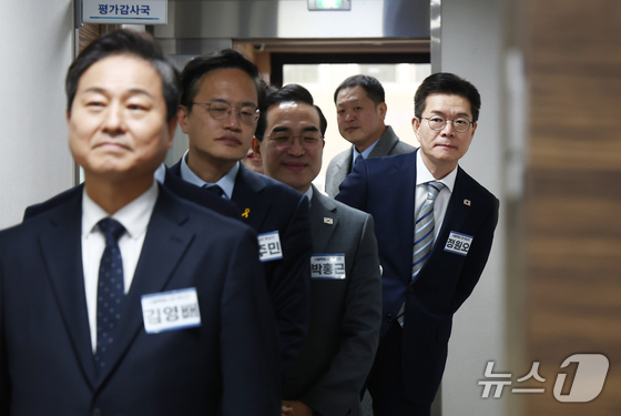 더불어민주당 서울시장 후보인 김영배·박주민·박홍근·전현희 의원과 정원오 성동구청장이 23일 오전 서울 영등포구 더불어민주당 당사에서 열린 중앙당공천관리위원회 2차 회의 및 광역단체장 후보자 면접에 참석하고 있다. 2026.2.23 © 뉴스1 김민지 기자