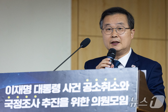 23일 서울 여의도 국회 의원회관에서 열린 더불어민주당 이재명 대통령 사건 공소취소와 국정조사 추진을 위한 의원모임 출범식·결의대회에서 이건태 간사가 경과보고를 하고 있다. 2026.2.23 © 뉴스1 유승관 기자