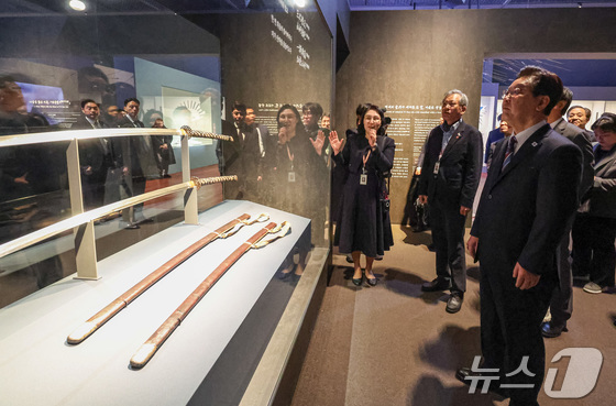 이재명 대통령과 김혜경 여사가 26일 서울 용산구 국립중앙박물관에서 열린 특별전 '우리들의 이순신’에서 이순신장검을 관람하고 있다. 2026.2.26 © 뉴스1 허경 기자