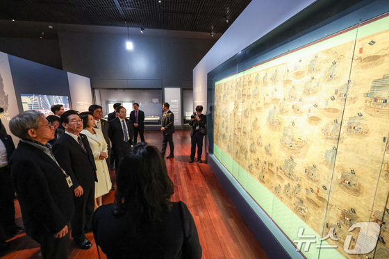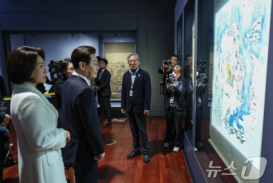 이재명 대통령과 김혜경 여사가 26일 서울 용산구 국립중앙박물관에서 열린 특별전 '우리들의 이순신’에서 수군조련도를 관람하고 있다. 2026.2.26 © 뉴스1 허경 기자