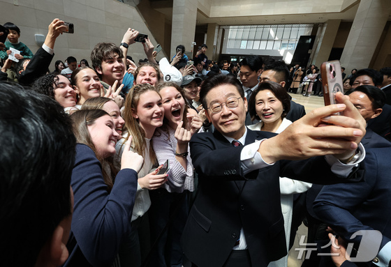 이재명 대통령과 김혜경 여사가 26일 서울 용산구 국립중앙박물관에서 열린 특별전 '우리들의 이순신'을 관람한 뒤 외국인 관광객들과 기념촬영을 하고 있다. 2026.2.26 © 뉴스1 허경 기자