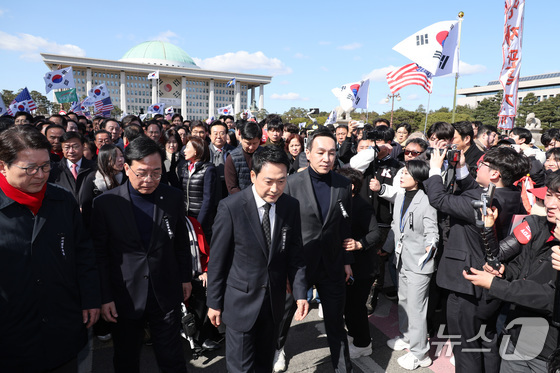 장동혁 국민의힘 대표가 3일 서울 여의도 국회 본관 앞에서 열린 사법독립 헌정수호를 위한 대국민 호소 국민대장정 규탄대회를 마친 후 청와대를 향해 행진하고 있다. 2026.3.3 © 뉴스1 신웅수 기자