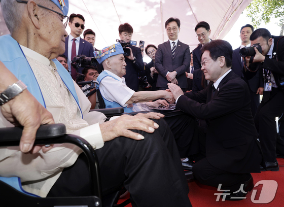 필리핀을 국빈 방문한 이재명 대통령이 4일(현지시간) 필리핀 마닐라 영웅묘지를 찾아 한국전 참전기념비에 헌화를 마친 후 참전용사들과 인사를 나누고 있다. 2026.3.4 © 뉴스1 허경 기자