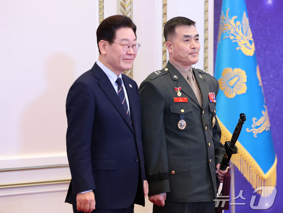 이재명 대통령이 6일 청와대 영빈관에서 열린 2026년 준장 진급 장성 삼정검 수여식에서 김문상 합참 민군작전부장(준장)에게 삼정검을 수여하고 있다. 2026.3.6 © 뉴스1 허경 기자