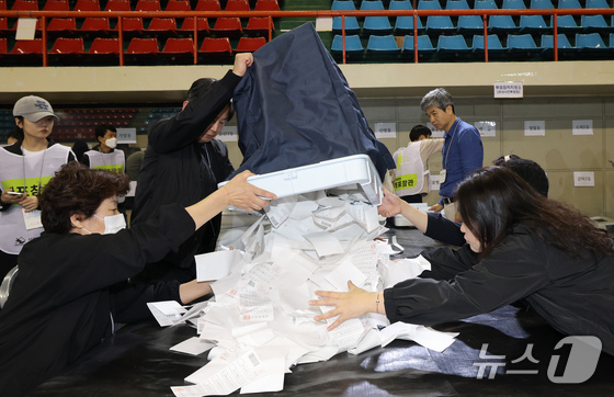 개표사무원들이 사전투표 투표함 투표용지를 꺼내고 있다. © 뉴스1 김기태 기자
