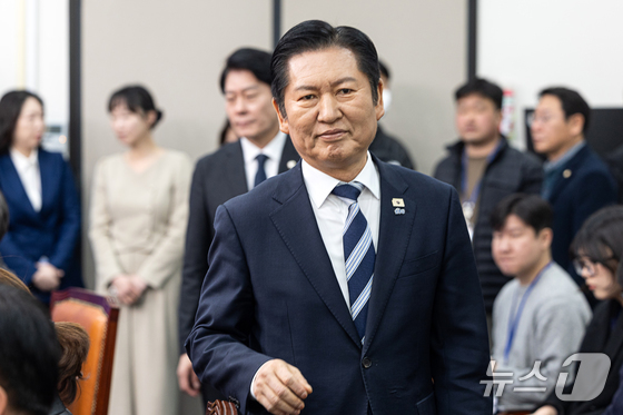 정청래 더불어민주당 대표가 8일 서울 여의도 국회에서 취임 후 두 번째 기자회견을 마치고 질의 응답을 위해 자리로 향하고 있다. 2026.3.8 © 뉴스1 이승배 기자
