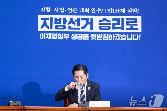 정청래 더불어민주당 대표가 8일 서울 여의도 국회에서 취임 후 두 번째 기자회견을 하며 물을 마시고 있다. 2026.3.8 © 뉴스1 이승배 기자