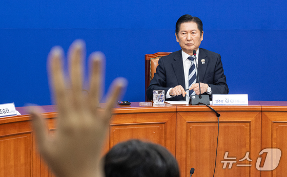정청래 더불어민주당 대표가 8일 서울 여의도 국회에서 취임 후 두 번째 기자회견을 하며 취재진의 질의를 듣고 있다. 2026.3.8 © 뉴스1 이승배 기자