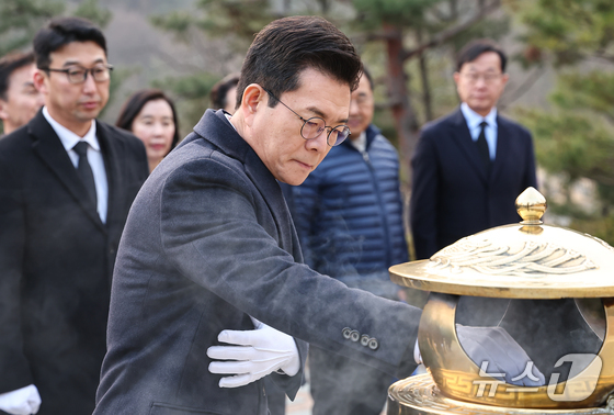 정원오 더불어민주당 서울시장 예비후보가 9일 서울 동작구 국립서울현충원 김대중 전 대통령묘소를 찾아 분향하고 있다. 2026.3.9 © 뉴스1 김도우 기자