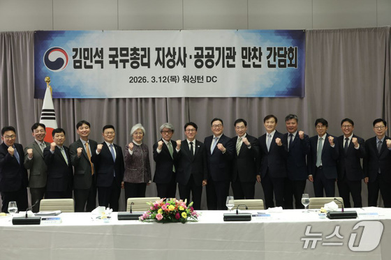김민석 국무총리가 12일(현지시간) 오후 미국 워싱턴 D.C. 콘래드 호텔에서 열린 지상사·공공기관 만찬 간담회에서 참석자들과 기념촬영을 하고 있다. (총리실 제공. 재판매 및 DB 금지) © 뉴스1 임세영 기자