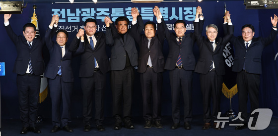 더불어민주당 전남광주 통합특별시장 경선 후보인 김영록(왼쪽부터), 강기정, 정준호 예비후보, 소병훈 중앙당 선거관리위원장, 주철현, 신정훈, 민형배, 이병훈 예비후보가 14일 오후 서울 영등포구 더불어민주당 중앙당사에서 열린 전남광주 통합특별시장 예비경선 합동연설회에서 기념 촬영을 하고 있다. 2026.3.14 © 뉴스1 최지환 기자