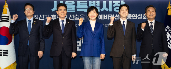 더불어민주당 서울시장 예비후보들이 21일 서울 여의도 당사에서 열린 서울특별시장 예비경선 합동연설회에 앞서 기념 촬영을 하고 있다. 왼쪽부터 박주민, 정원오, 전현희, 김형남, 김영배 예비후보. 2026.3.21 © 뉴스1 유승관 기자