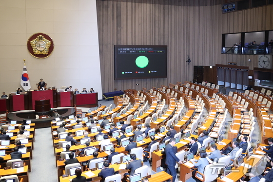 22일 서울 여의도 국회에서 열린 제433회 국회(임시회) 제2차 본회의에서 윤석열 정권 정치검찰 조작기소 의혹 사건 진상규명 국정조사계획서 승인의 건이 통과되고 있다. 2026.3.22 © 뉴스1 이승배 기자