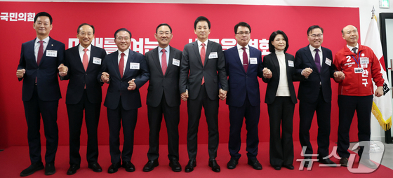 국민의힘 대구시장 공천 후보로 나선 최은석 의원(왼쪽부터), 추경호 의원, 윤재옥 의원, 주호영 의원, 유영하 의원, 이재만 전 대구 동구청장, 이진숙 전 방송통신위원장, 홍석준 전 의원, 김한구 전 현대차 노조 대의원이 10일 서울 영등포구 여의도 국민의힘 당사에서 열린 6·3 지방선거 광역단체장 및 중앙당 관할 기초단체장 후보자 면접에 참석해 기념 촬영을 하고 있다. 2026.3.10 © 뉴스1 김진환 기자