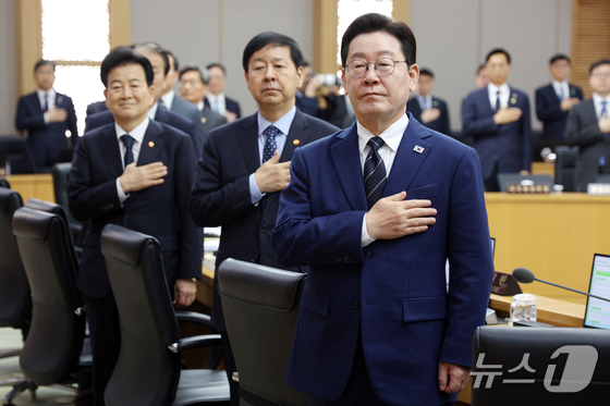 이재명 대통령이 17일 정부세종청사에서 열린 국무회의에서 국민의례를 하고 있다. (청와대통신사진기자단) 2026.3.17 © 뉴스1 이재명 기자