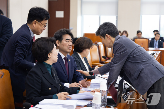 국회 행정안전위원회 여야 간사인 더불어민주당 윤건영(오른쪽), 국민의힘 서범수 의원이 24일 서울 여의도 국회에서 법안심사소위원회를 앞두고 이성권 국민의힘 의원과 대화를 나누고 있다. 2026.3.24 © 뉴스1 유승관 기자