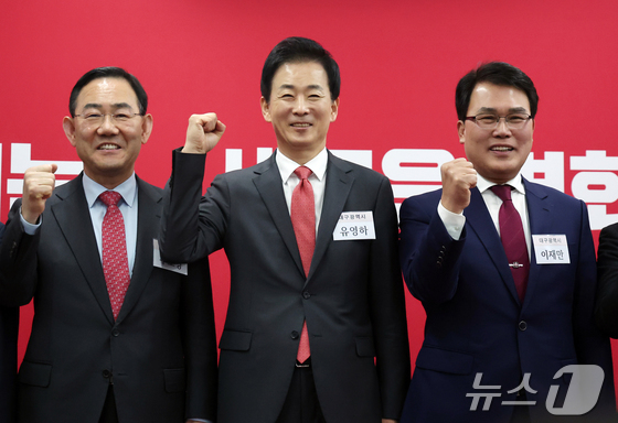 국민의힘 대구시장 공천 후보로 나선 주호영 의원(왼쪽부터), 유영하 의원, 이재만 전 대구 동구청장이 10일 서울 영등포구 여의도 국민의힘 당사에서 열린 6·3 지방선거 광역단체장 및 중앙당 관할 기초단체장 후보자 면접에 참석해 기념 촬영을 하고 있다. 2026.3.10 © 뉴스1 김진환 기자
