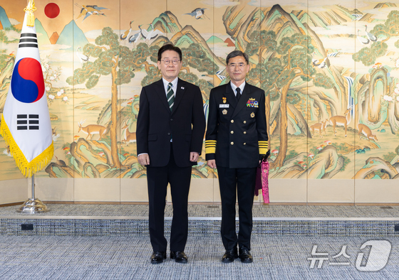 이재명 대통령이 27일 서울 용산구 국방부에서 김경률 신임 해군참모총장에게 삼정검 수치를 수여한 뒤 기념촬영을 하고 있다. (청와대 제공. 재판매 및 DB 금지) 2026.3.27 © 뉴스1 허경 기자
