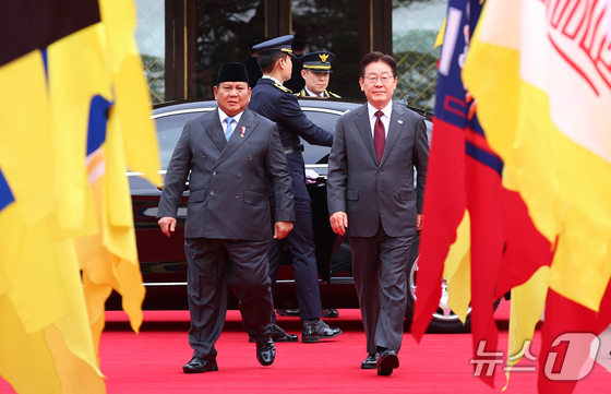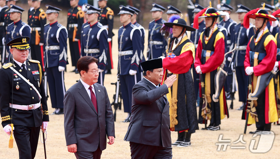 이재명 대통령과 프라보워 수비안토 인도네시아 대통령이 1일 청와대에서 열린 공식 환영식에서 의장대를 사열하고 있다. 2026.4.1 © 뉴스1 이재명 기자