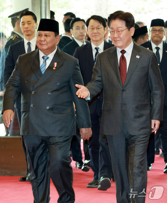 이재명 대통령이 1일 청와대에서 국빈 방한한 프라보워 수비안토 인도네시아 대통령을 영접하고 있다. 2026.4.1 © 뉴스1 이재명 기자