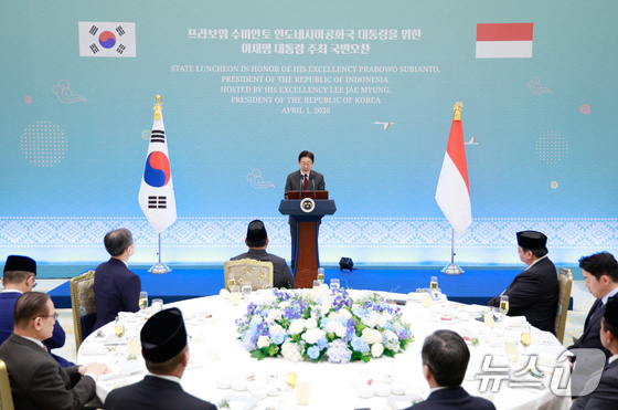 이재명 대통령이 1일 청와대에서 열린 프라보워 수비안토 인도네시아 대통령 국빈 방한 환영 오찬에서 환영사를 하고 있다. (청와대통신사진기자단)2026.4.1 © 뉴스1 허경 기자