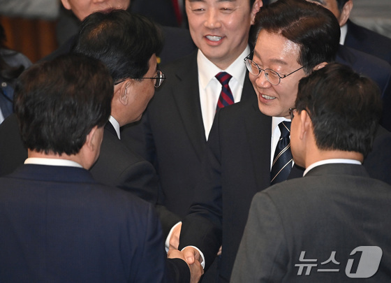 이 대통령은 정청래 대표 등 지도부를 시작으로 민주당 의원들과 악수하며 이동했고, 박찬대·노종면 의원 등 1기 원내대표단과는 짧은 대화를 나눴다. 오는 6·3 지방선거 출마를 위해 경기도지사, 전남광주통합특별시장 경선을 치르고 있는 한준호·민형배 의원과도 이야기를 주고 받았다.