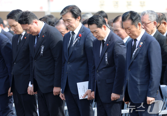 정청래 더불어민주당 대표(오른쪽부터), 장동혁 국민의힘 대표, 조국 조국혁신당 대표, 천하람 개혁신당 대표가 3일 오전 제주4·3평화공원에서 열린 제78주년 4·3 희생자 추념식 참석해 묵념하고 있다. 2026.4.3 © 뉴스1 오미란 기자