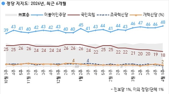 그러나 올해 3월 들어 흐름이 다시 악화했다. 3월에 19~21%로 내려앉더니 이번 4월 첫째 주 조사에서 18%를 기록하며 조기 대선 패배 직후 수준으로 되돌아갔다. 반면 민주당은 같은 기간 40%대 중반에서 48%까지 우상향 곡선을 그리고 있어, 양당 간 격차는 갈수록 벌어지는 추세다.