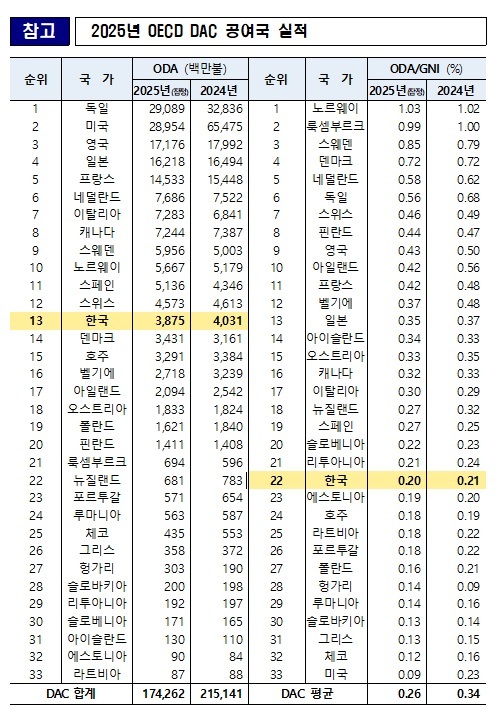 다만 미국(55.8% 감소), 독일(11.4%) 감소), 영국(4.5% 감소)과 같은 주요 공여국들이 급격한 감소율을 기록한 것과 비교할 때, 한국은 상대적으로 완만한 수준을 나타내며 실적 하락을 최소화한 것으로 평가된다고 국무조정실은 설명했다.
