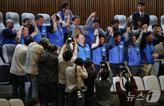 31일 서울 여의도 국회에서 열린 제433회국회(임시회) 제3차 본회의에서 공휴일에 관한 법률 일부개정법률안(대안)이 통과되자 대한민국공무원노동조합총연맹 조합원들이 기뻐하고 있다. 2026.3.31 © 뉴스1 김도우 기자